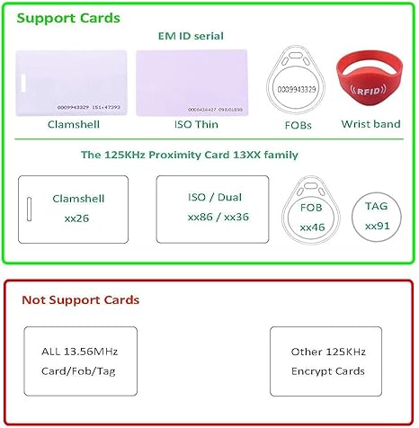 ✔ Amplio soporte de formatos: Compatible con tarjetas EM4100 ID y tarjetas 1326, 1346, 1386 ISO Prox, en formatos H10301, H10304, entre otros.